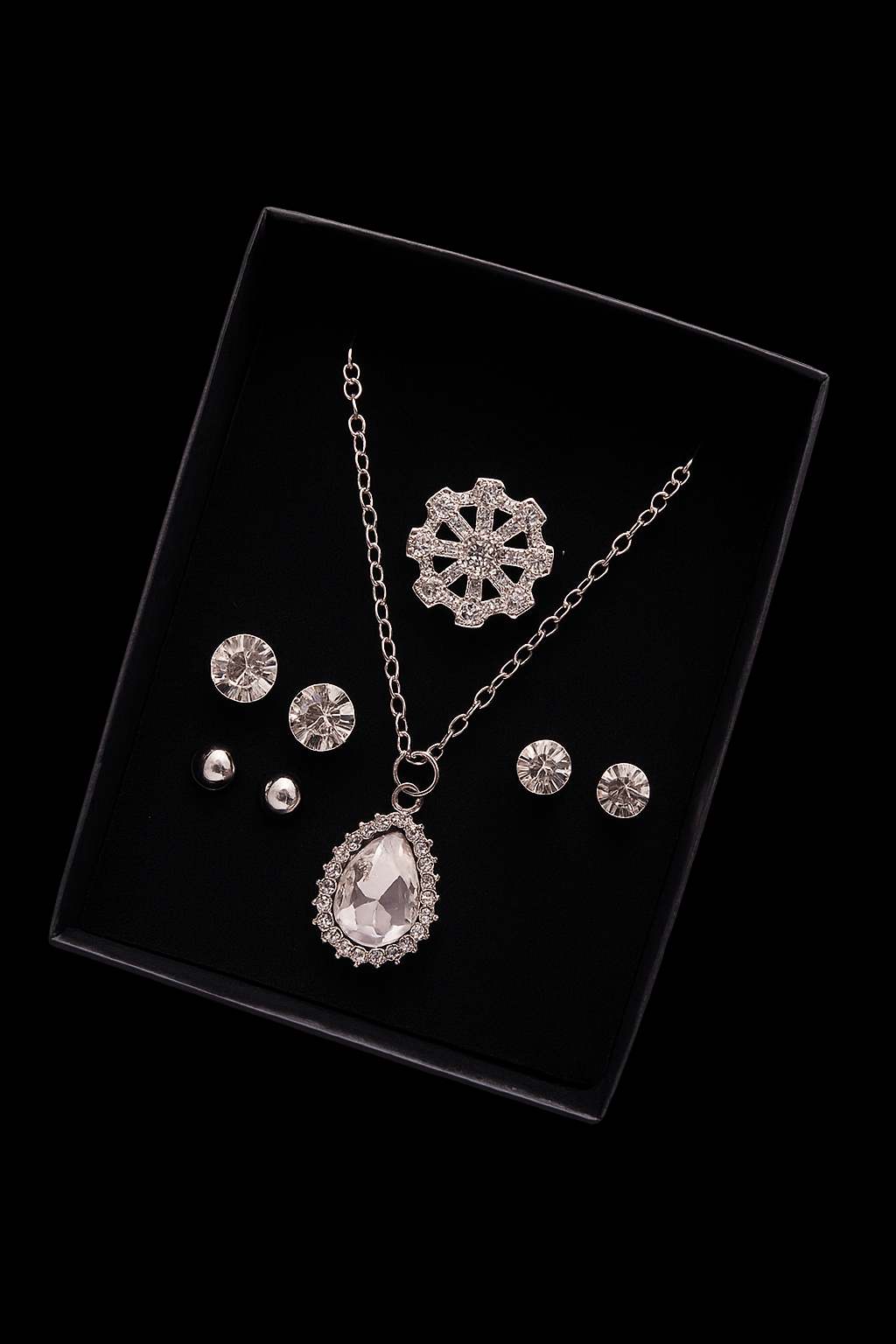 Add timeless beauty to your collection with this teardrop pendant necklace and crystal stud earrings. The dazzling teardrop charm is framed with precision-cut stones, perfect for special occasions or gifting. Comes in a velvet black box for a luxurious presentation.