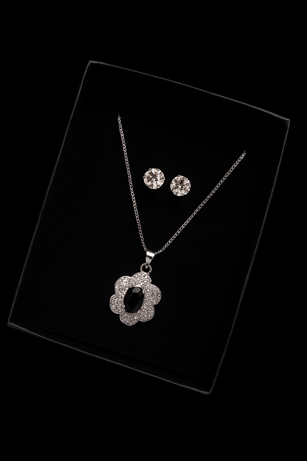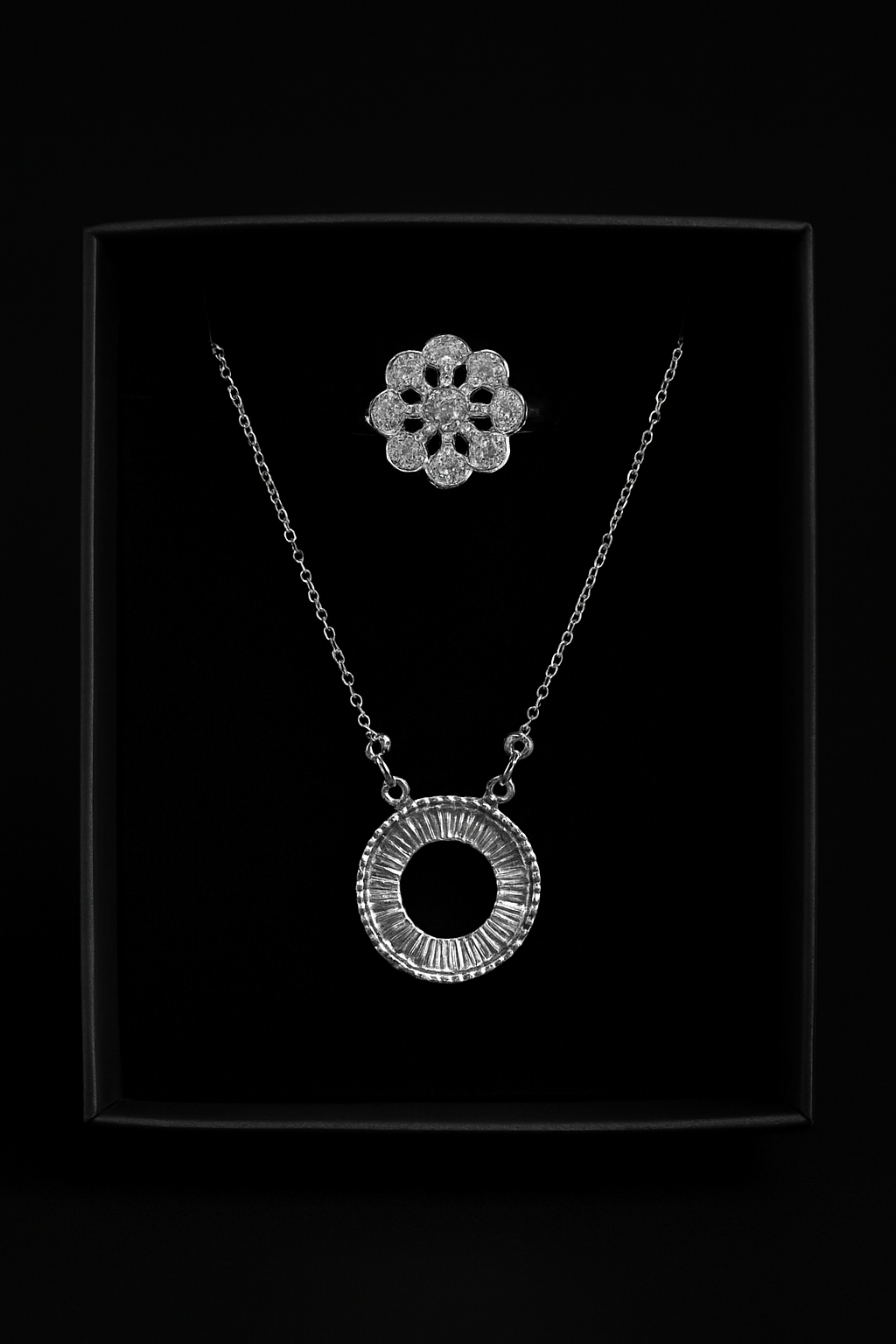 This sparkling set features a radiant circle pendant necklace and a crown-style brooch, intricately designed to reflect light from every angle. Stylish, elegant, and versatile for formal and festive wear.